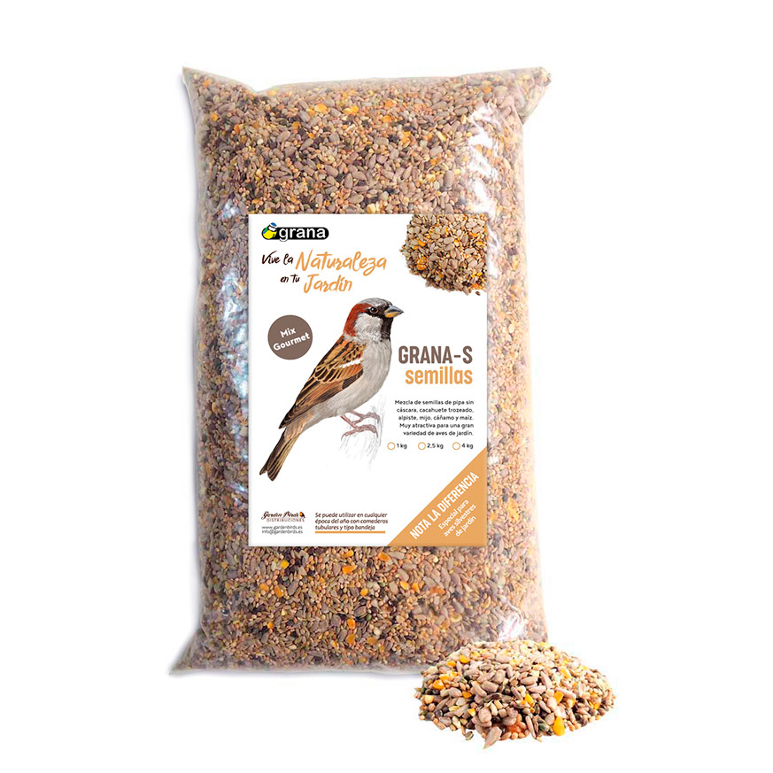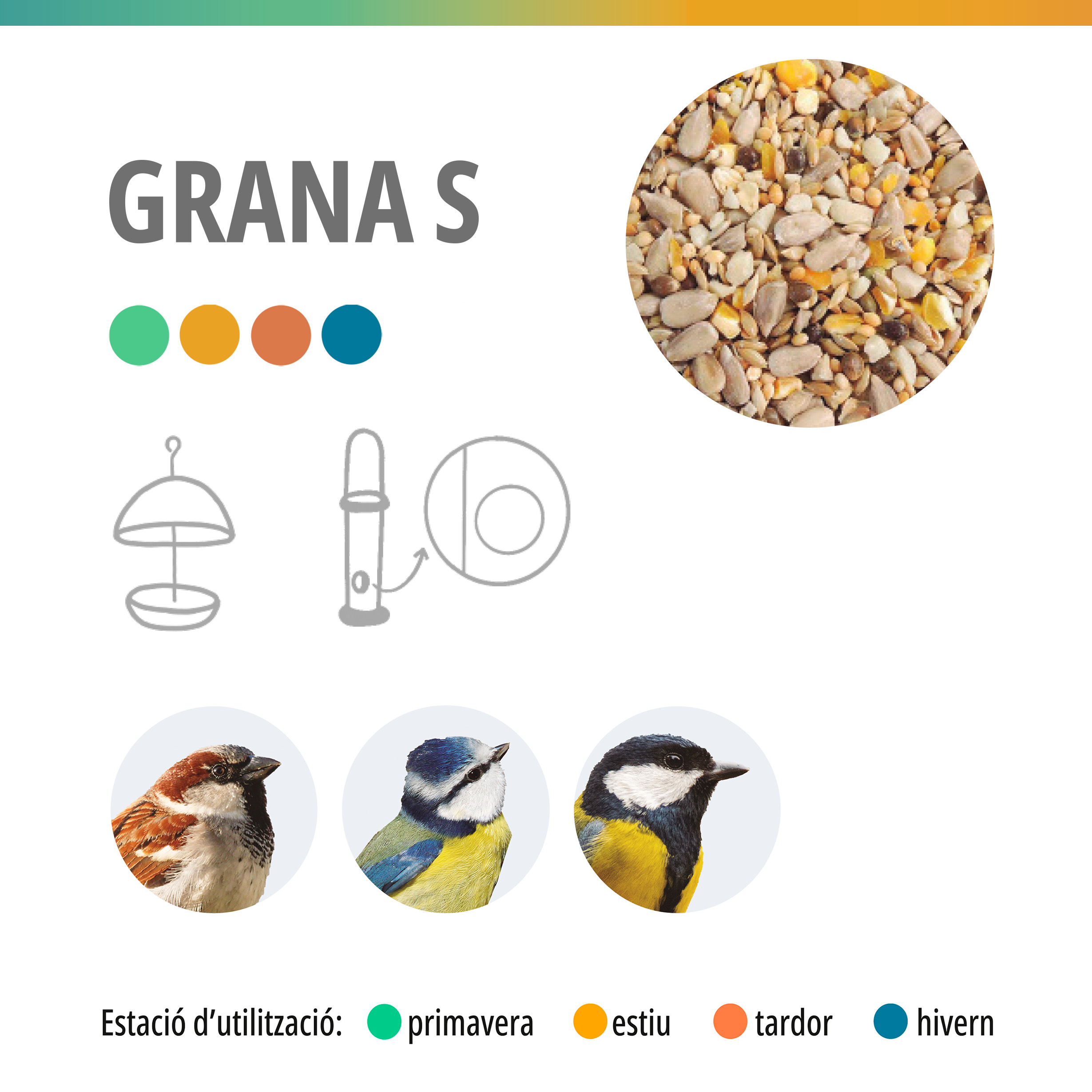 La grana S és apta per a posar a menjadores tubulars amb obertura lateral (mai amb malla!), del tipus tremuja i menjadores obertes, que totes elles es poden posar tant als balcons, terrasses, jardins com patis. Oferim tres bosses de diferents quantitats: 1 kg, 2,5 kg i 4 kg.