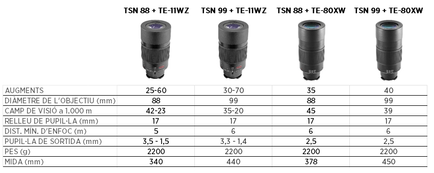El nou ocular TE-11WZ II ofereix diferent rang d'augments en funció del diàmetre de l'objectiu, sent de 25 a 60 augments en els TSN 88 i de 30 a 70 augments en els TSN 99, mantenint en tot el rang una gran qualitat d'imatge i un ampli camp de visió.