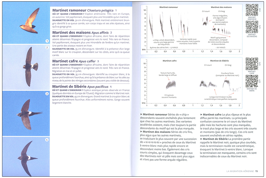 The reader will find the most important visual critera for a field identification, many pictures of birds in flight and informations about the migratory behaviour (where and when it can be seen) for each species. But most importantly, he will find a complete description of the main types of calls that can be heard for each species, with annotaed sonagrams that help memorizing them and provide objective criteria for a sound identification.