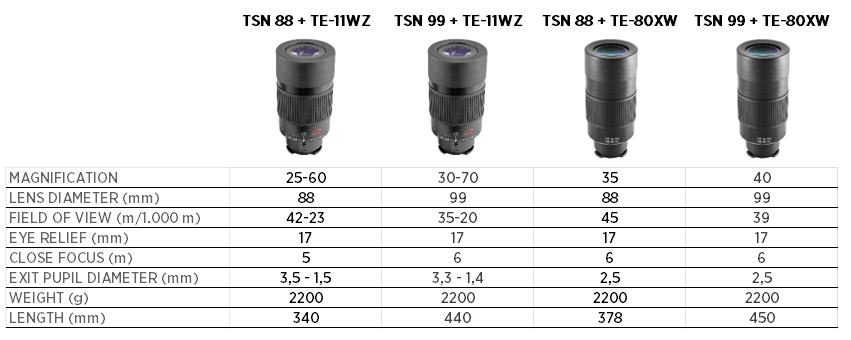 During the test the eyepieces TE-11WZ II 30-70x, TE-80XW and TSN-EX16 were used, the first being the most versatile and the one that most users will probably choose. In the case of TE-80XW, although image quality and field of view are truly exceptional, for my preference, 40x magnification is too much when you are, for example, observing passerines at a middle distance.