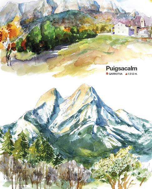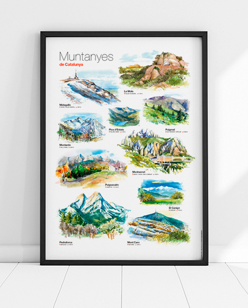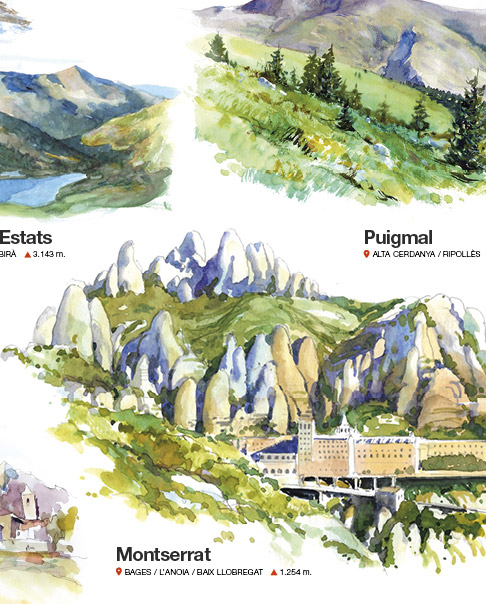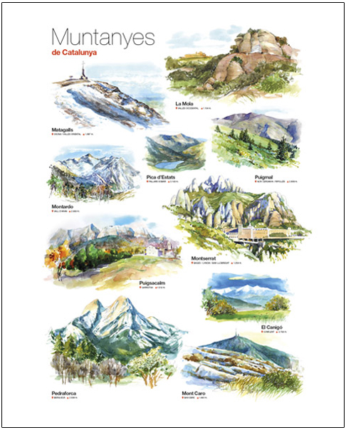 Il·lustracions originals (©Carles Vallalta Serra) en aquarel·la dels 10 cims més singulars de Catalunya. Tamany: DIN A2 (42 x 59,4 cm)