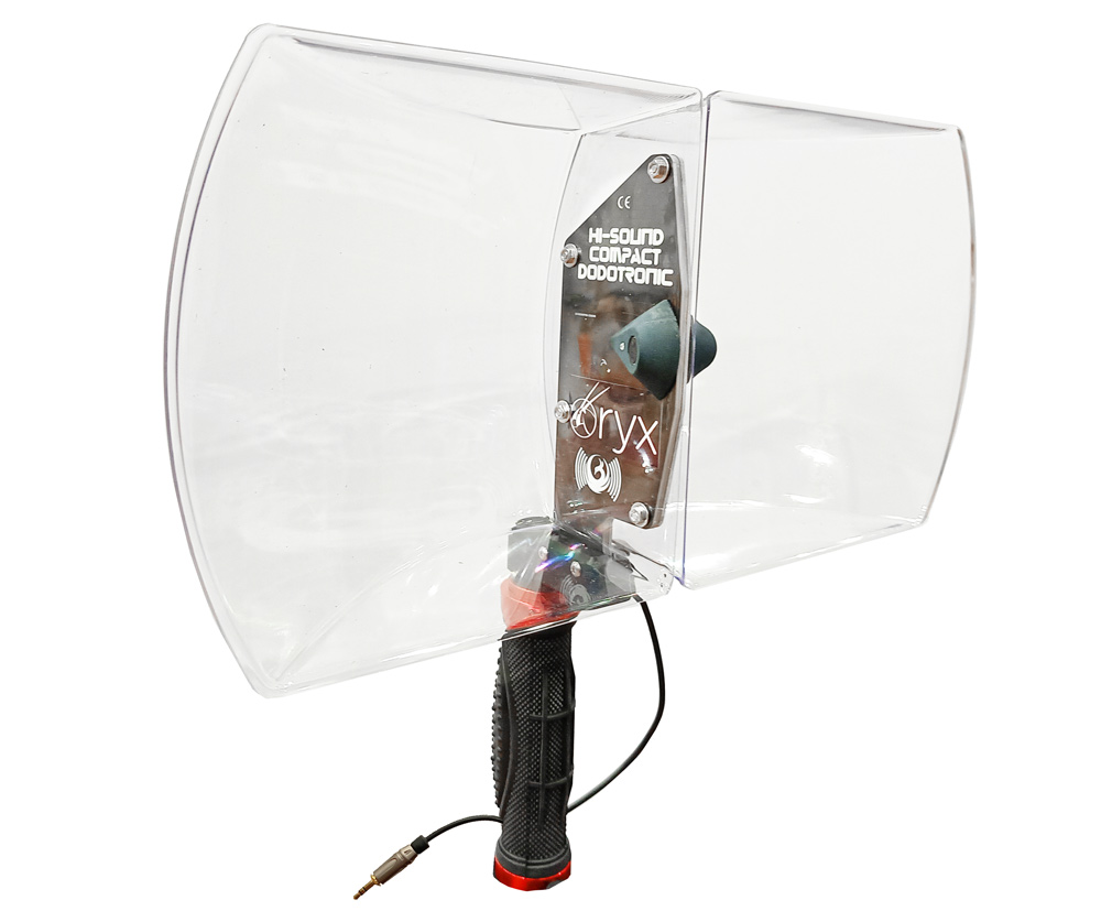 Sistema compacto y muy ligero de micrófono estéreo de gran calidad y parábola de policarbonato, con alta sensibilidad y bajo ruido, capaz de captar sonidos poco intensos y a gran distancia, especialmente indicado para grabar cantos de aves y sonido espacial en la naturaleza, aunque no es impermeable. Este nuevo modelo de Dodotronic está específicamente diseñado para poder usarlo directamente con cámaras de vídeo. También se puede usar con una grabadora convencional de la misma forma que el resto de micrófonos de la marca. El efecto estéreo se ve incrementado gracias a la separación de canales mediante un tabique separador entre cada par de micrófonos, que tiene un foco distinto cada uno. El plato está compuesto por dos circuitos con blindaje superior e inferior; el mismo blindaje está firmemente conectado a tierra de las dos cápsulas para minimizar la inmunidad a interferencias externas. La salida es con un mini-jack stereo de 3.5 mm con 1 m de cable. La parábola consta de dos paneles que concentran el sonido de forma independiente en cada canal. El mango es de aluminio, lo que mejora la resistencia mecánica y aligera el peso, con cobertura acolchada para prevenir ruidos y tiene una rosca para trípode en su base. El diseño y color de la parábola la hacen poco visible a la fauna. Incluye protector antiviento para reducir las interferencias causadas por el viento y maletín acolchado de transporte. Requiere grabadores con Plug-in-power (cualquiera de las Tascam que se ofrecen en Weboryx.com).