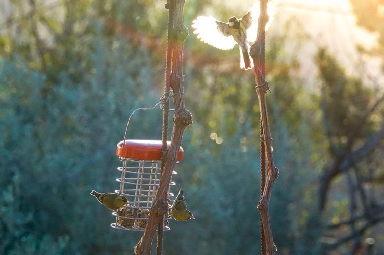 Trabajo muchas horas delante del ordenador, por lo cual agradezco mucho a menudo echar un vistazo por la ventana y descansar la vista enfocando más allá de la pantalla del ordenador. ¿Y qué mejor que tener comederos para observar la presencia y belleza de las aves silvestres? Este invierno, como los anteriores, he colgado algunos comederos justo fuera del estudio donde trabajo, y en la terraza de mi casa.