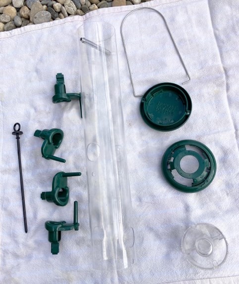 Lúganos en el comedero Ring Pull tubular con GRANA P y el mismo comedero después de ser limpiado, asecándose antes de ser otra vez rellenada de semillas