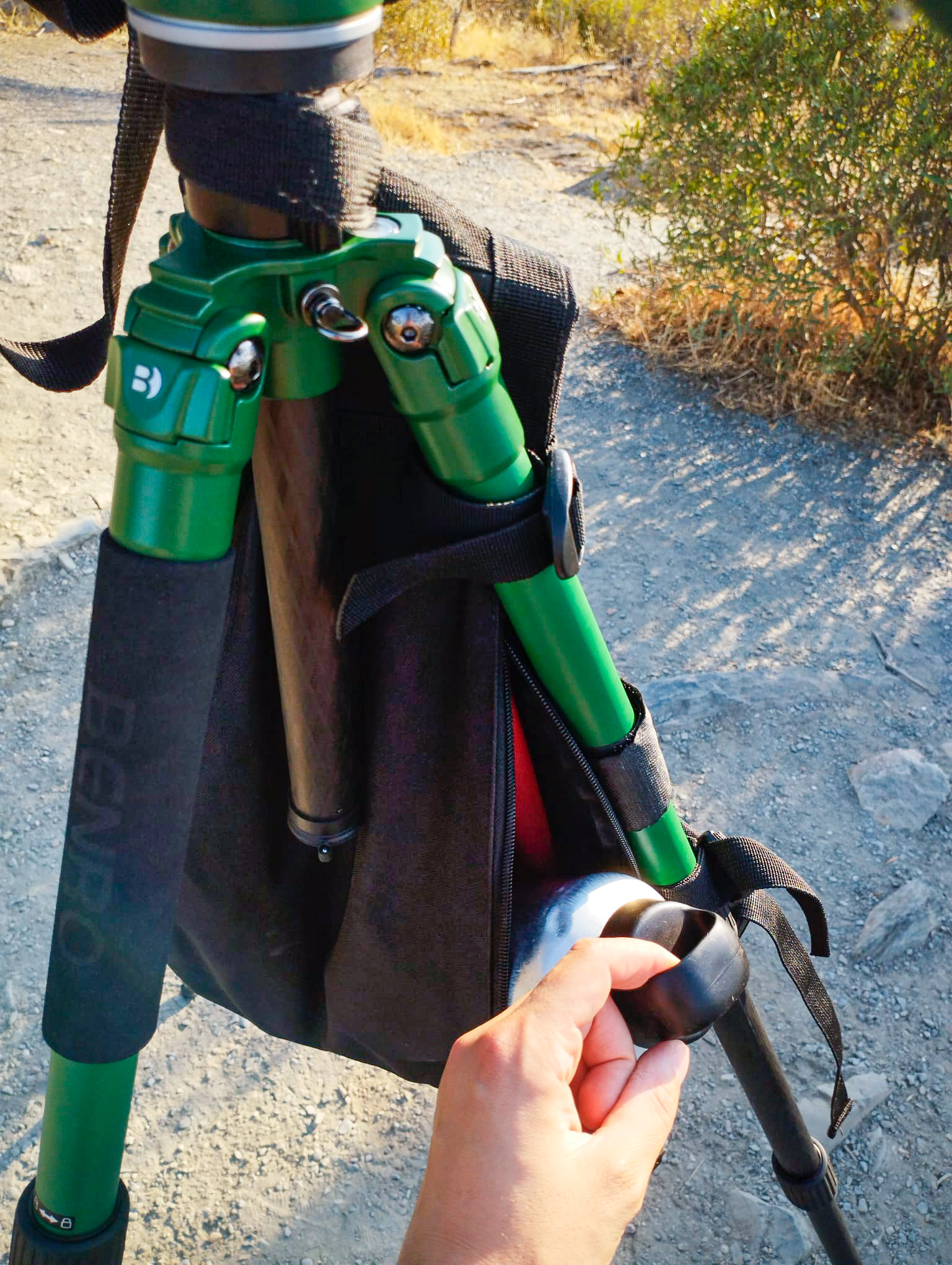 Te permite transportar a modo de mochila el trípode montado con la rótula y el telescopio, solo tienes que descolgar la mochila y abrir las patas del trípode (ya que no recomiendo llevar el trípode abierto, al menos no con las patas desplegadas).