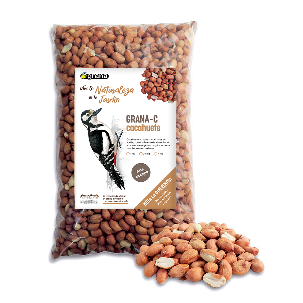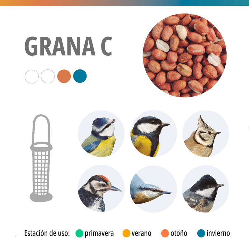 La grana C, con cacahuetes pelados, enteros, crudos y sin sal, es un alimento de un elevado contenido calórico que les ayuda durante estos meses donde el alimento escasea, por lo que se recomienda su uso sólo en el otoño y el invierno. Con estos cacahuetes las aves silvestres notan la diferencia, ya que son de un tamaño mayor que les gusta más, no se cuelan por el agujero de la malla, tardan más rato en comérselos y no se los pueden llevar del comedero.