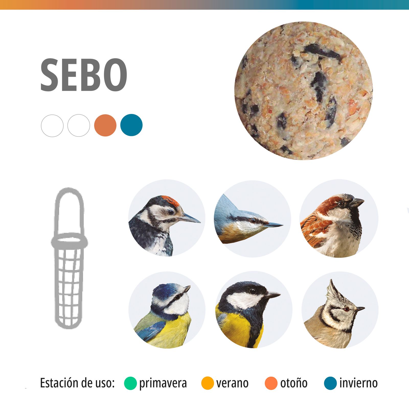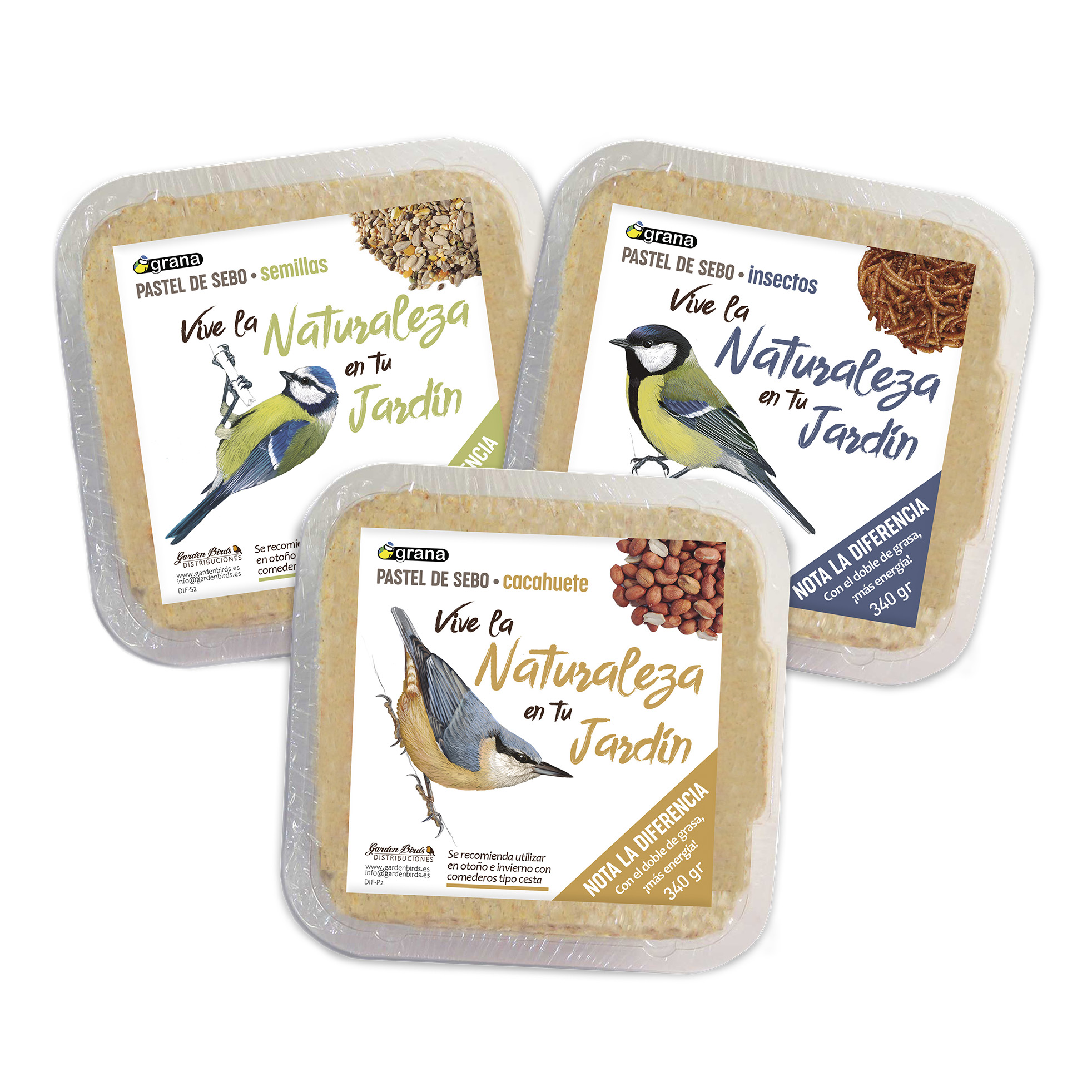 Disponemos de tres productos con base de sebo: las bolas, los pasteles y los tubos de sebo. Todos estos productos se presentan combinados con otros alimentos, que pueden incluir gusanos deshidratados, mezcla de semillas, trozos de cacahuete o frutos del bosque.