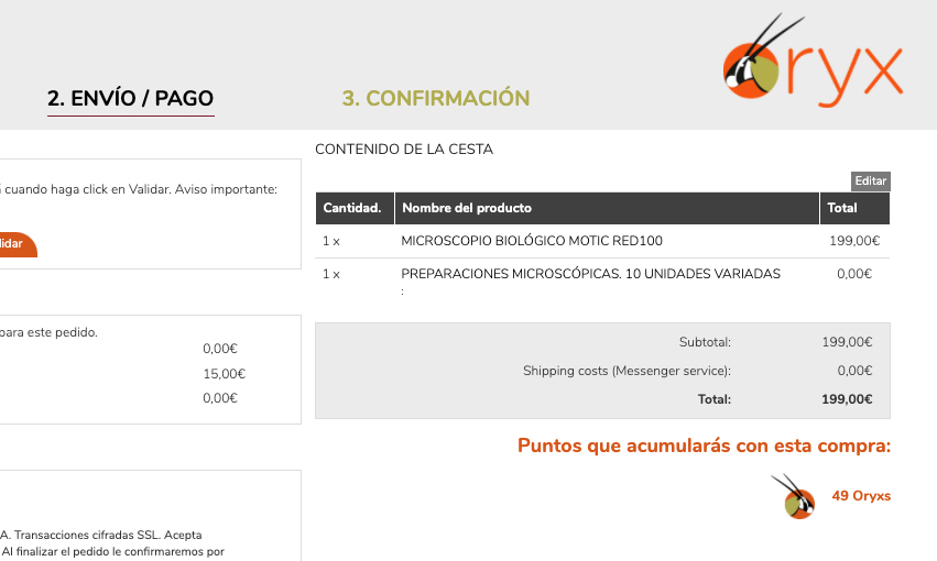 Podrás convertir tus ORYXs acumulados en euros de descuento al siguiente pedido que hagas con el mismo usuario registrado. En el proceso de compra verás reflejados el equivalente en € de los puntos disponibles. En cada pedido podrás optar para aplicar el descuento o seguir acumulando puntos para el siguiente pedido.