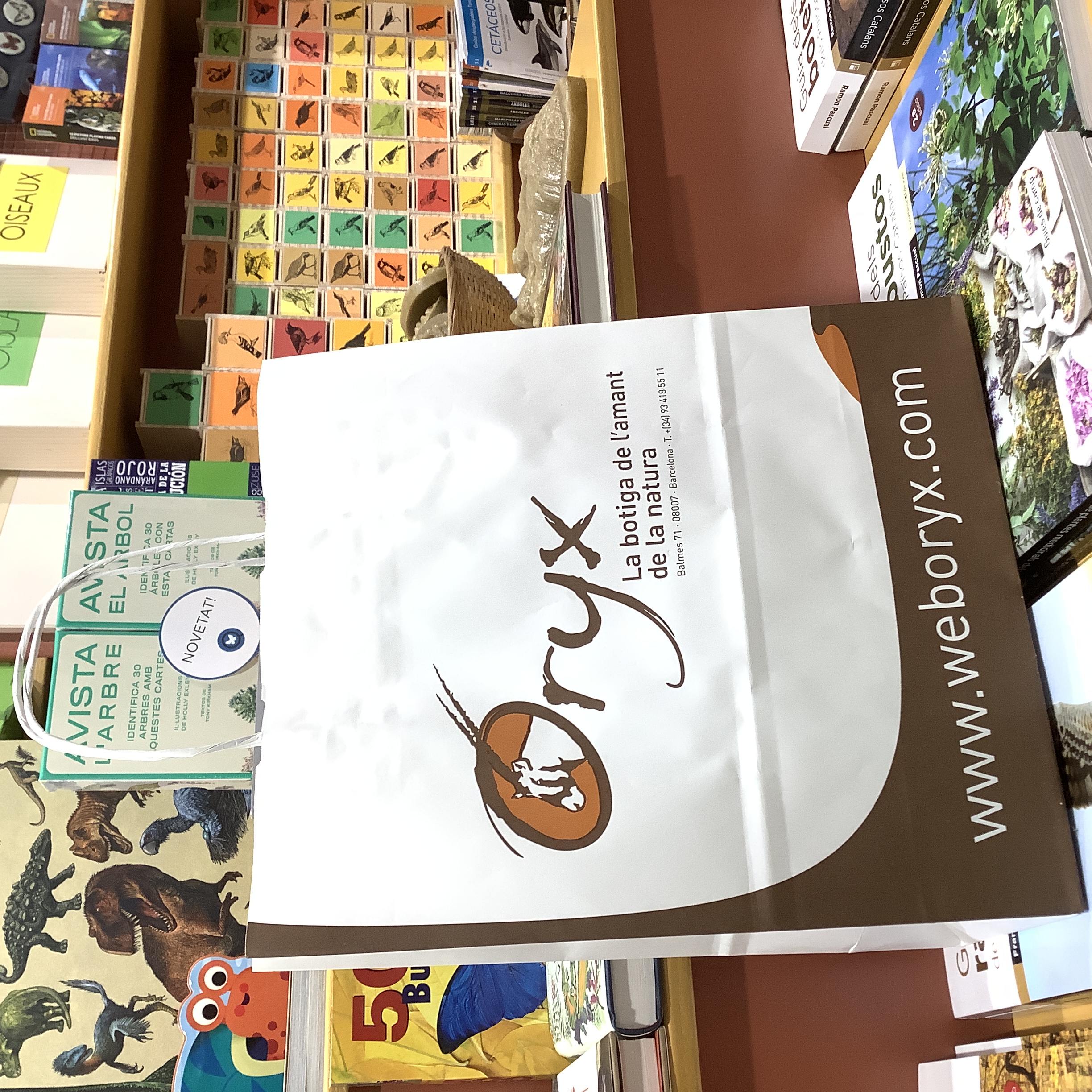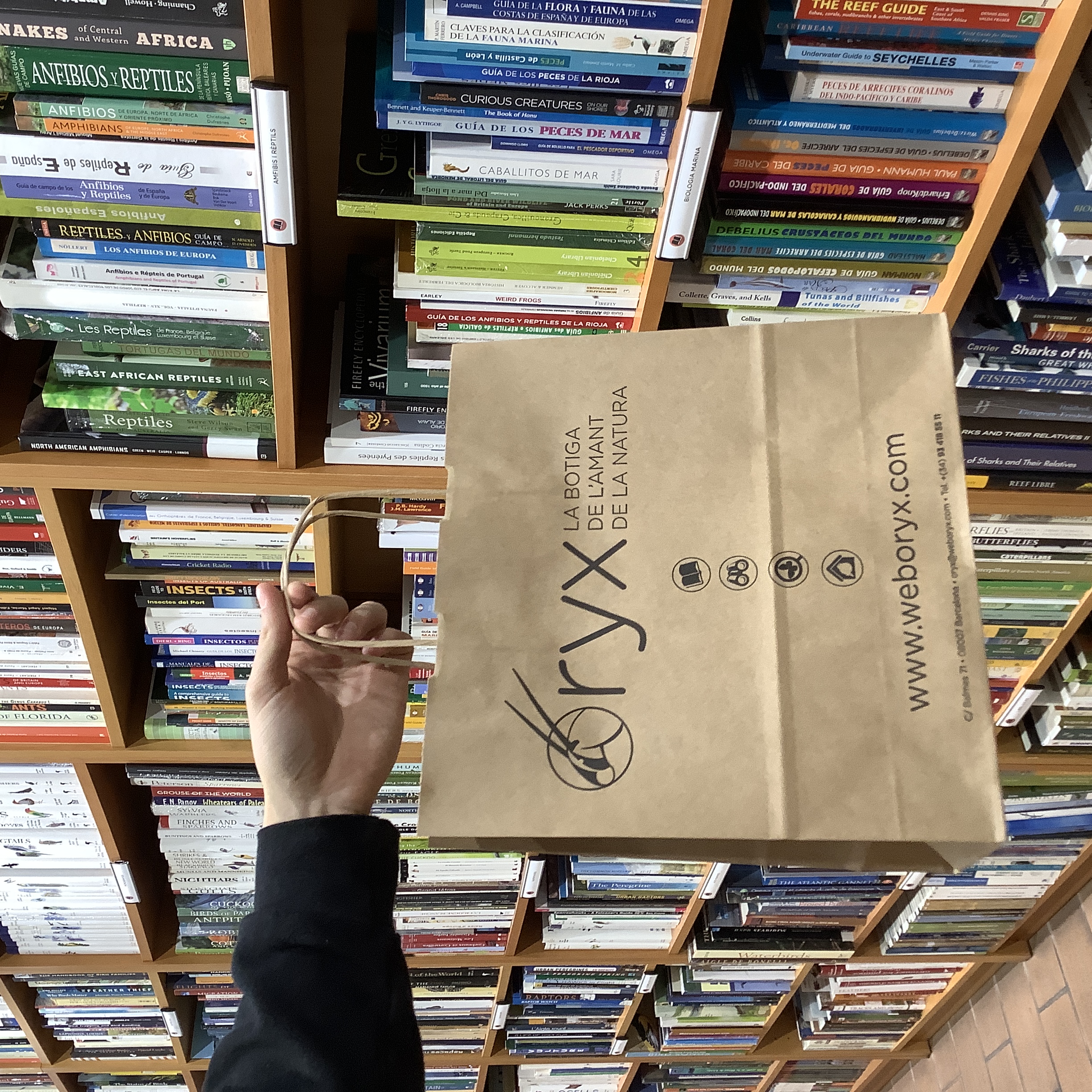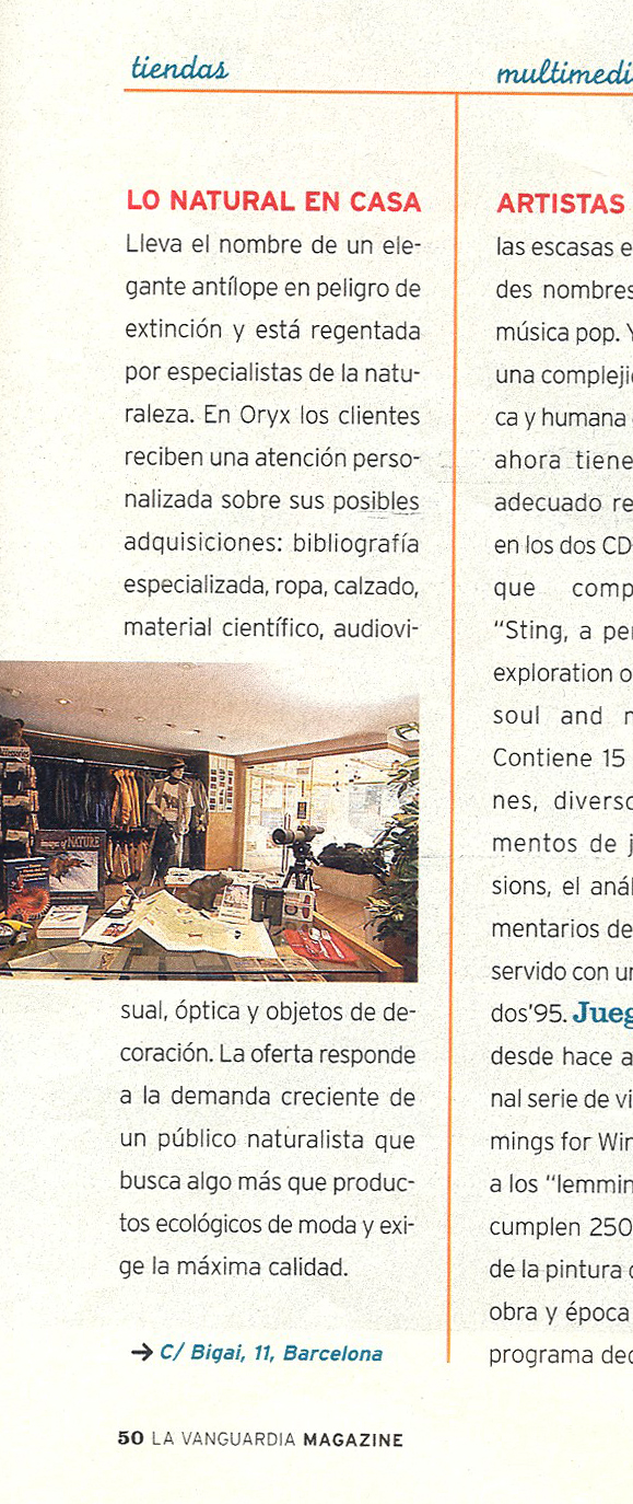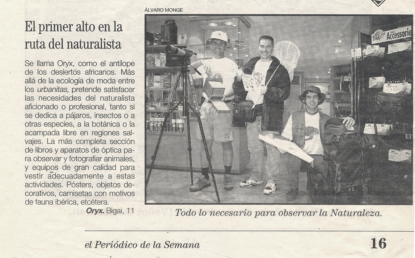 Oryx, antílope subsahariano con alguna de sus especies en peligro de extinción, fue el nombre elegido para un proyecto que nació el enero del año 1996. Una serie de circunstancias confluyeron para que en la calle Bigai, cerca de la plaza Bonanova, se abriera una tienda muy pequeña, ORYX, La Tienda del Amante de la Naturaleza. Los libros ocupaban solo tres estantes y los prismáticos una sola vitrina, pero las cosas que queríamos tener eran muchas y todas parecían bastante difíciles de conseguir. Tan solo teníamos un ordenador y por supuesto, ¡no había conexión a internet!