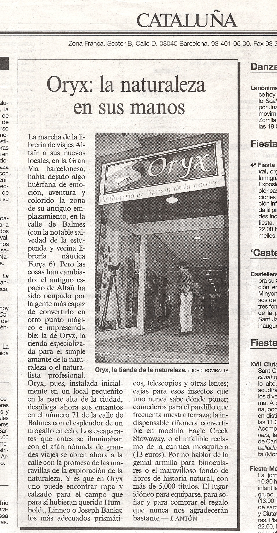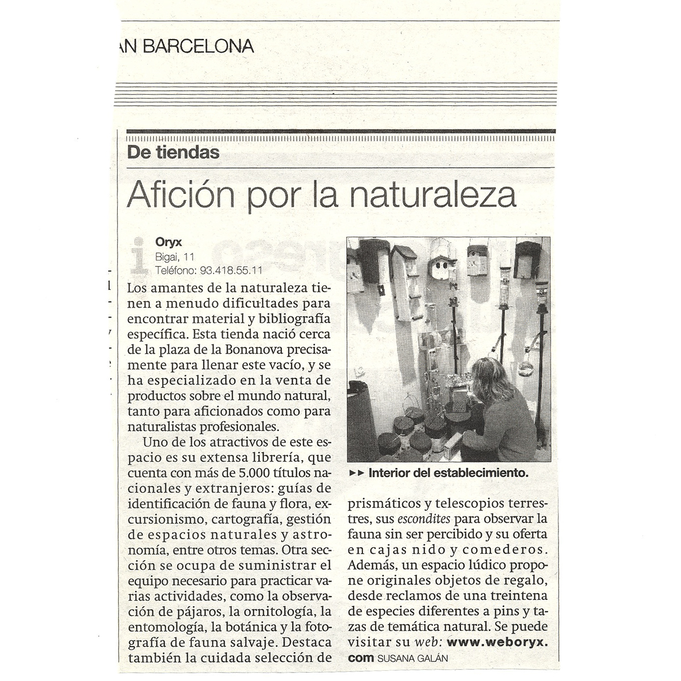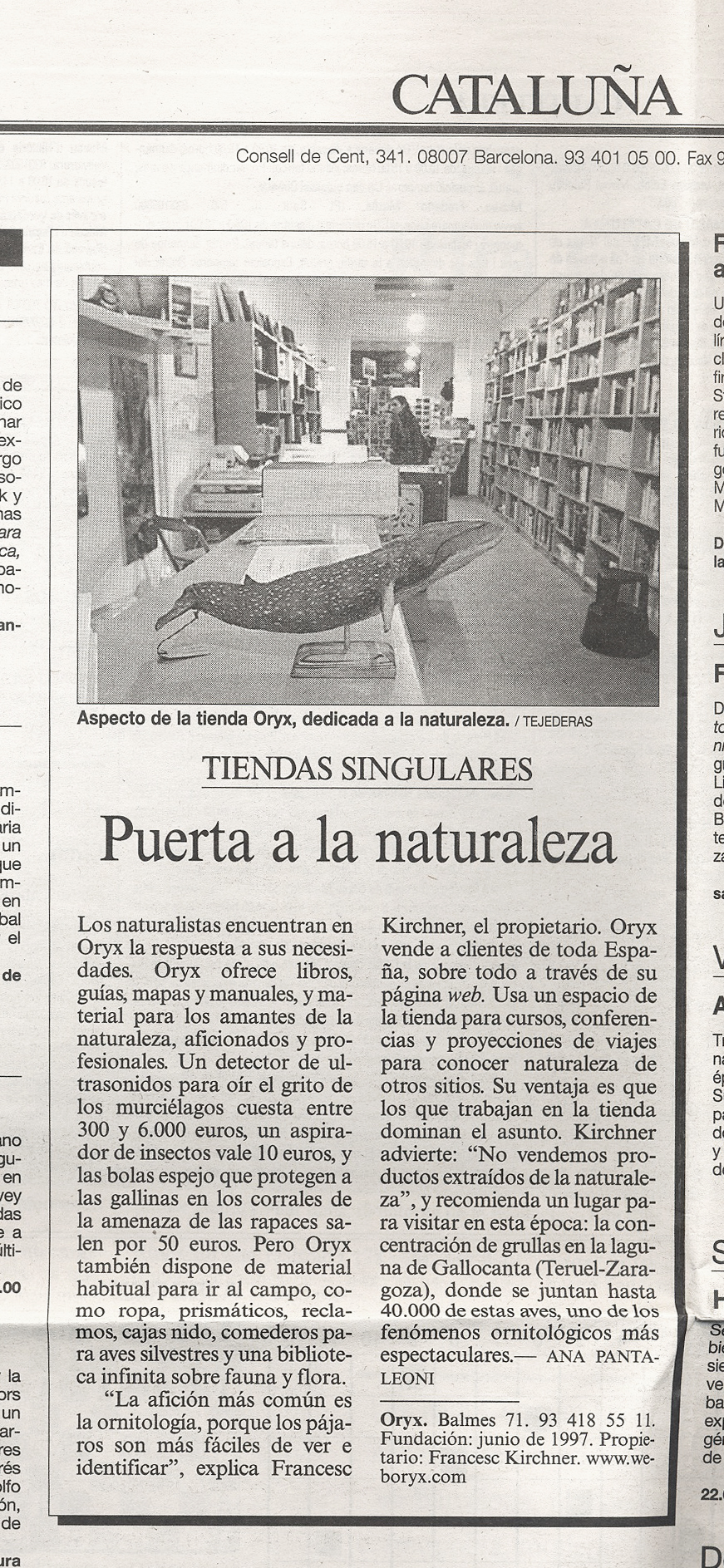 Oryx, antílope subsahariano con alguna de sus especies en peligro de extinción, fue el nombre elegido para un proyecto que nació el enero del año 1996. Una serie de circunstancias confluyeron para que en la calle Bigai, cerca de la plaza Bonanova, se abriera una tienda muy pequeña, ORYX, La Tienda del Amante de la Naturaleza. Los libros ocupaban solo tres estantes y los prismáticos una sola vitrina, pero las cosas que queríamos tener eran muchas y todas parecían bastante difíciles de conseguir. Tan solo teníamos un ordenador y por supuesto, ¡no había conexión a internet!
